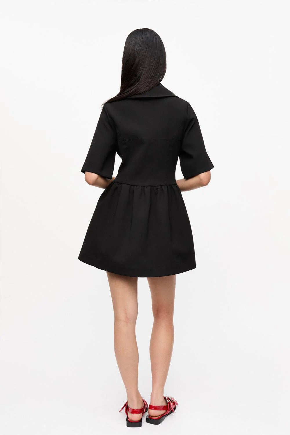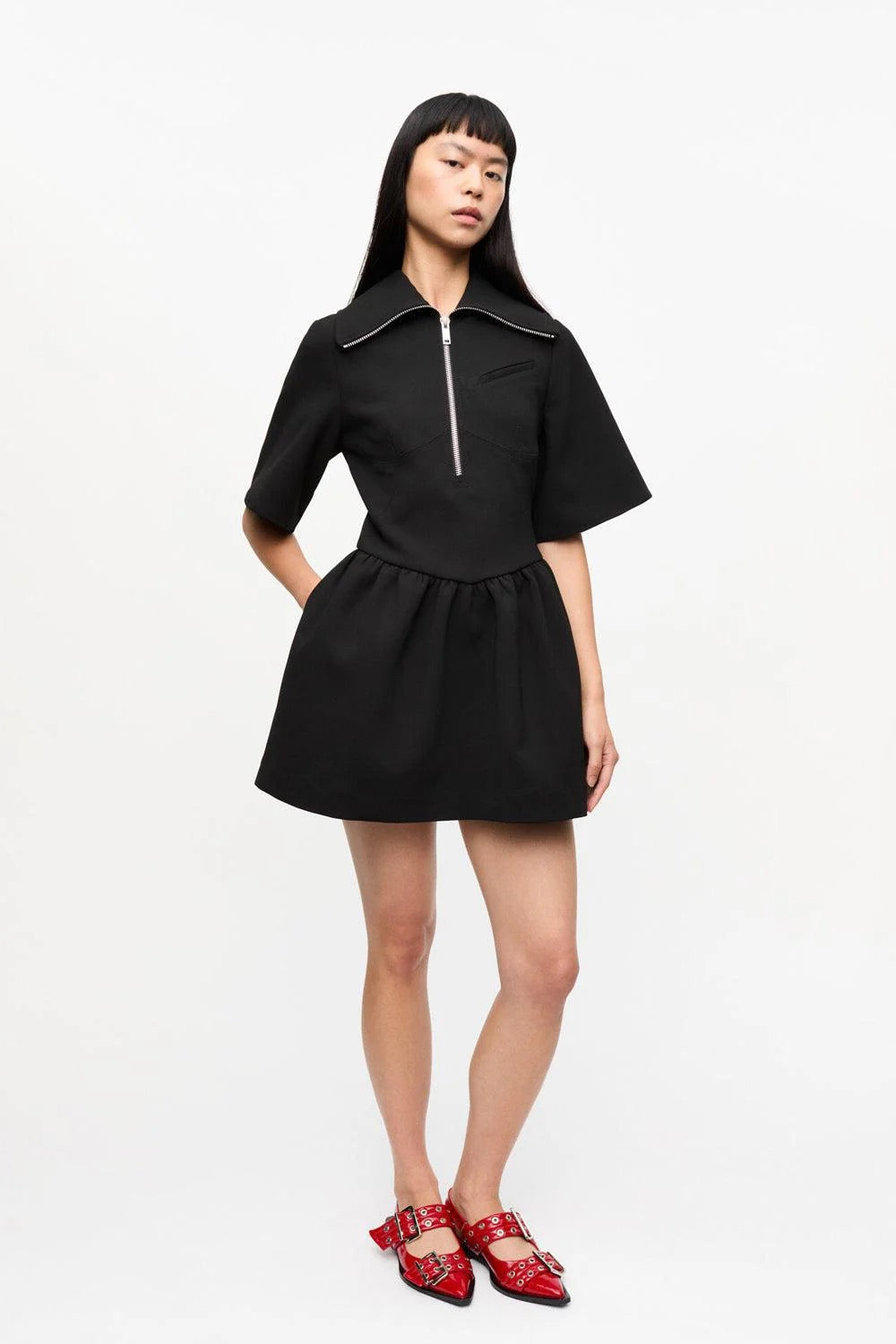 Bonded Crepe Mini Dress fra Ganni. Minikjole i krepp med krage og flagrende skjørt. Kjolen fra populære Ganni kommer med sølvfarget glidelås, har en teksturert kreppaktig finish og en høy krage som kan brettes både opp og ned. Kjolen fra Ganni kan enkelt styles til alle sesongens begivenheter.