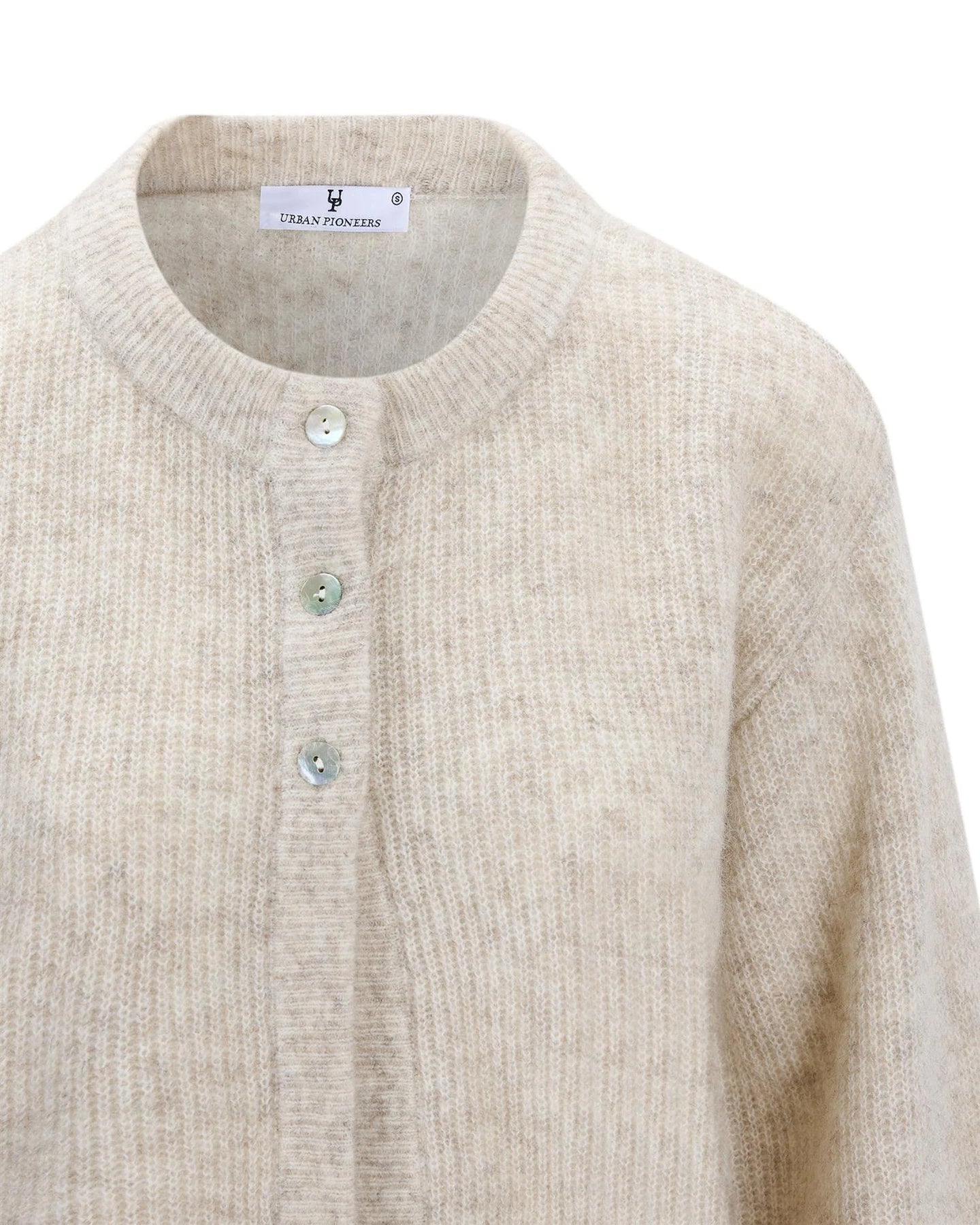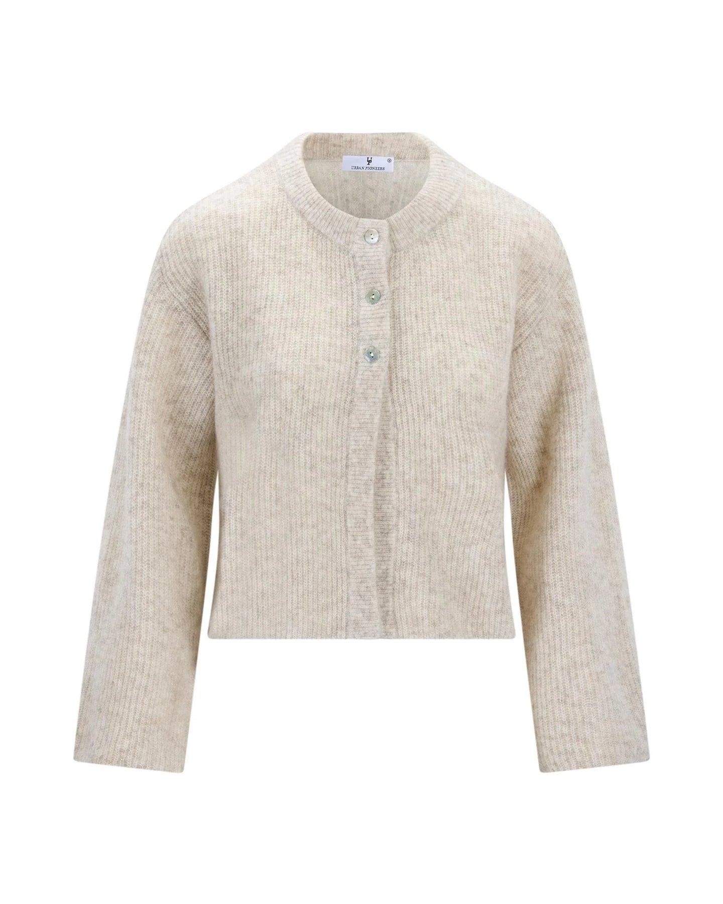 Santina Cardigan fra Urban Pioneers. Santina Cardigan er en myk og feminin cardigan med en lett, luftig strikk som gir et sofistikert uttrykk. Designet har rund hals, knappelukking i front og en avslappet silhuett som gjør den enkel å style både til hverdag og mer pyntede anledninger. Normal i størrelsen.