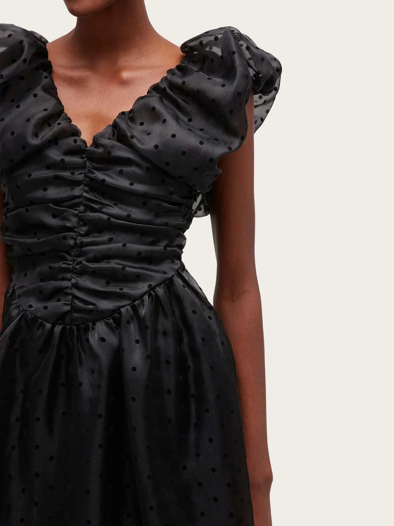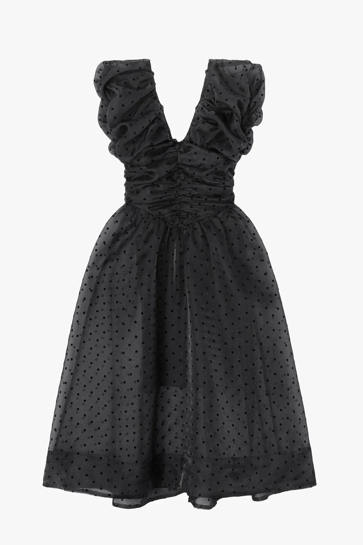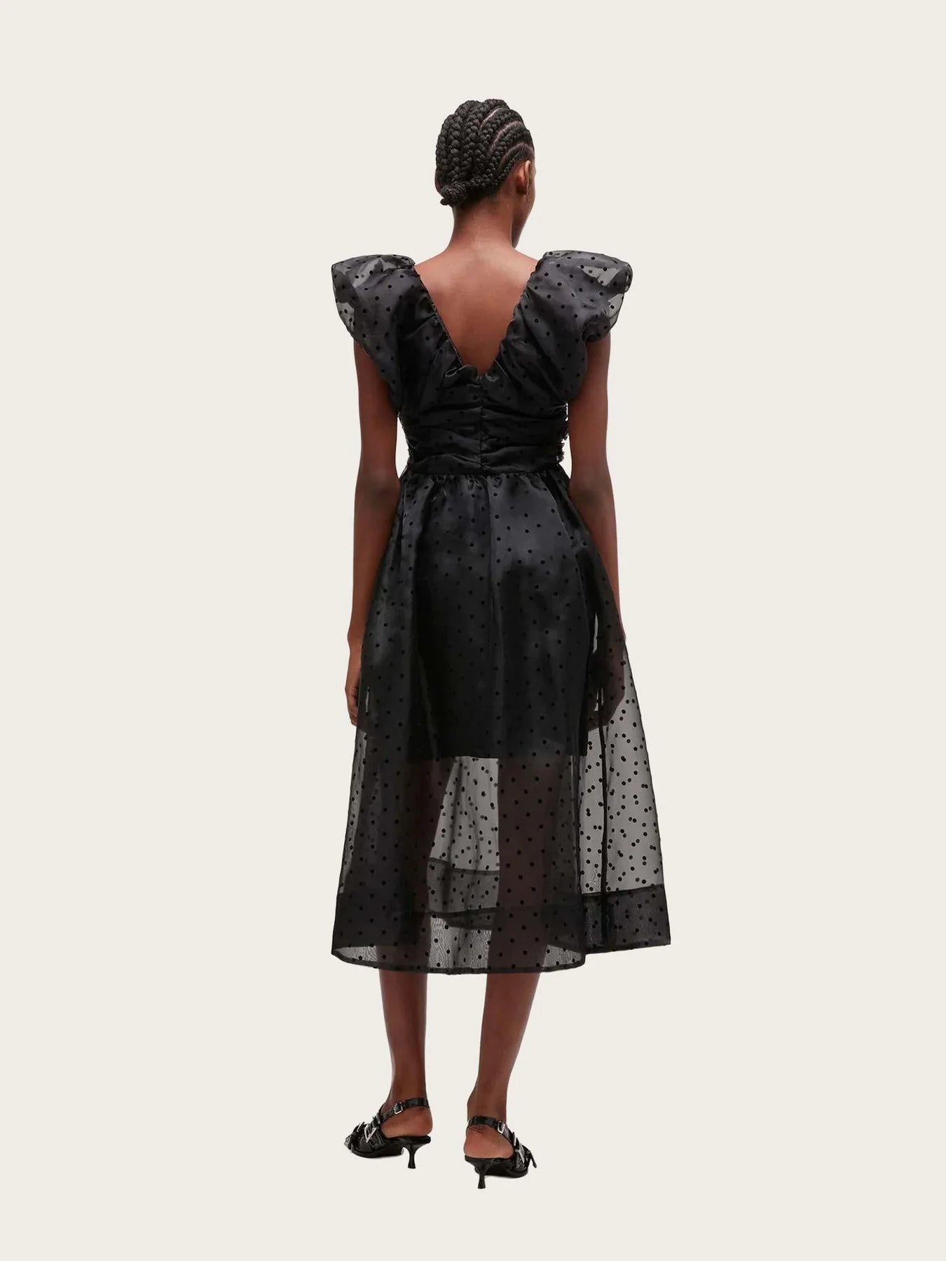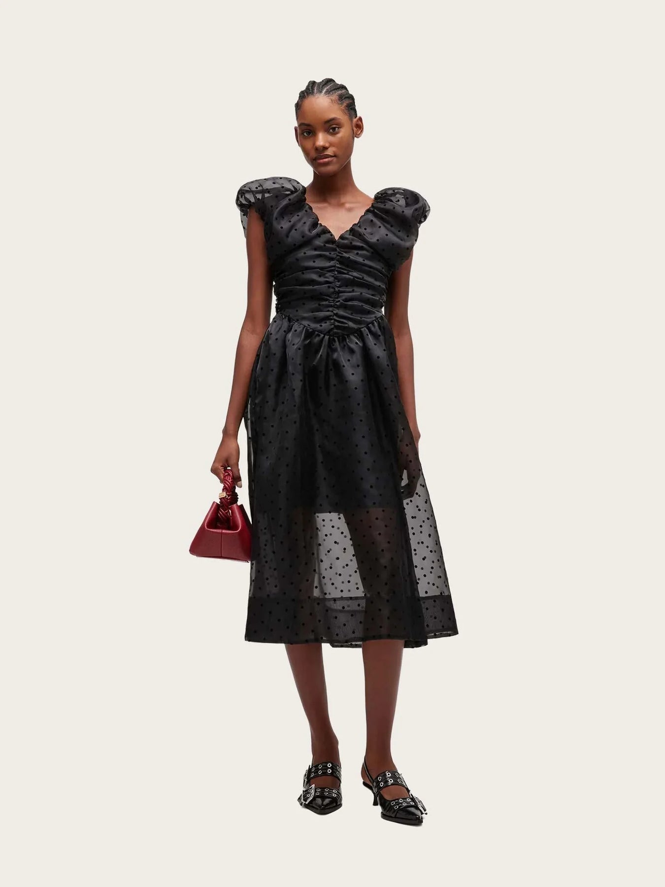 Elegant midikjole fra GANNI i lett, gjennomsiktig organza med delikat flokket prikkemønster. Kjolen har en figurnær overdel med rynkedetaljer som fremhever midjen, kombinert med voluminøse puffermer og dyp V-utringning både foran og bak for et romantisk og moderne uttrykk. Det A-formede skjørtet faller elegant til midt på leggen og gjør kjolen perfekt til festlige anledninger.