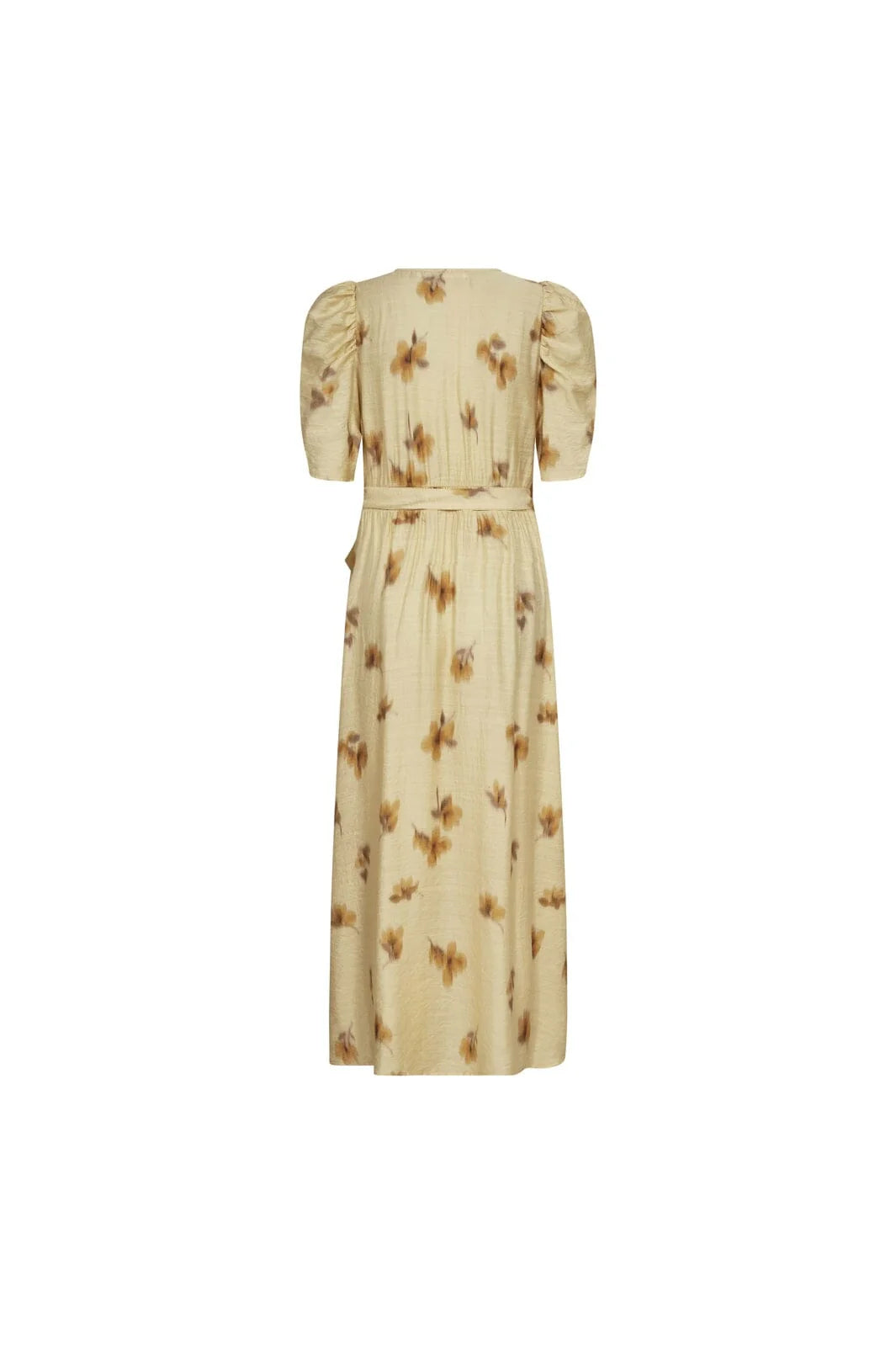Omslagskjole fra Co Couture i en lysegul nyanse med blomsterprint. Kjolen har korte, puffede ermer og knytebånd i midjen.
