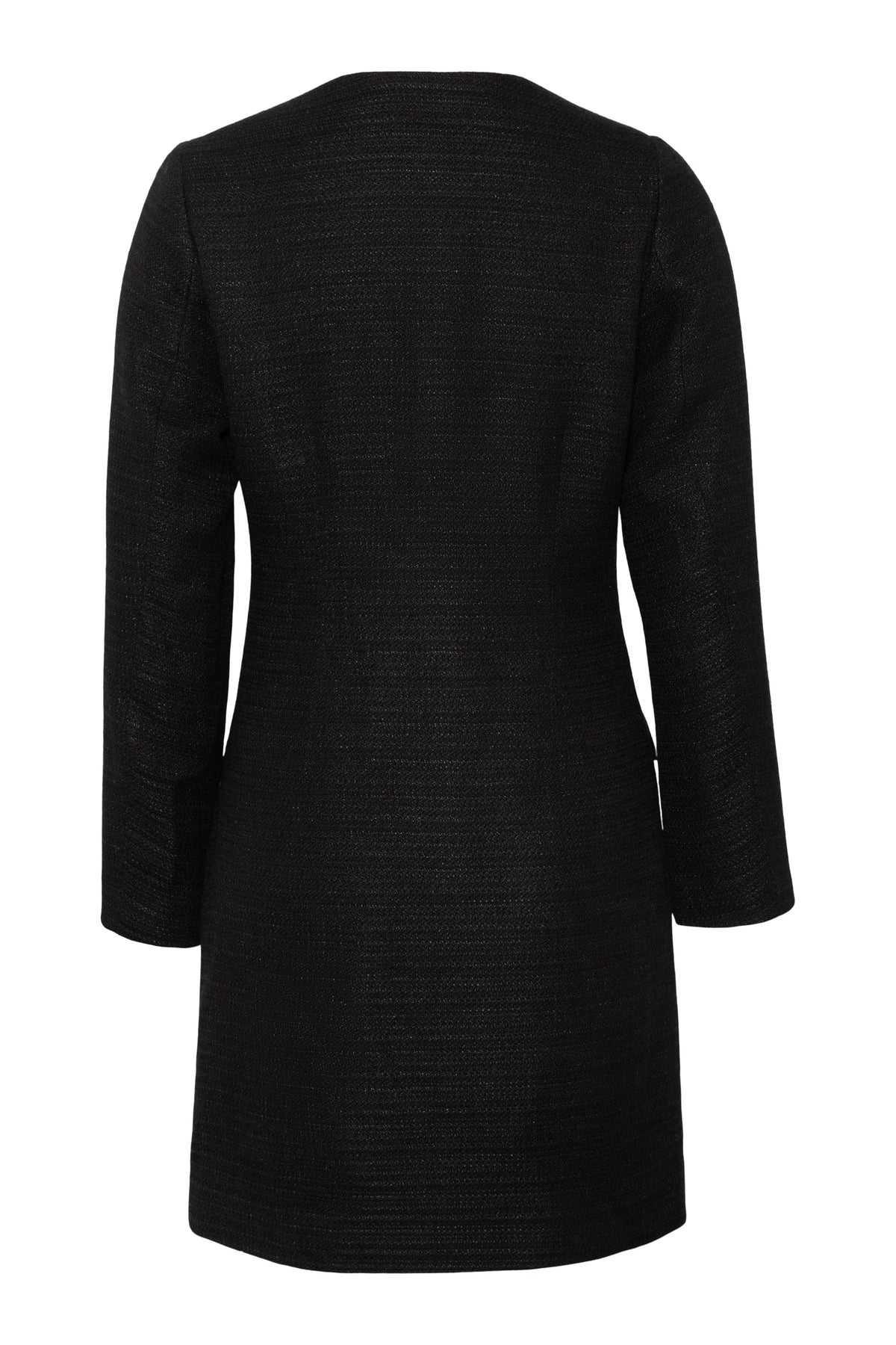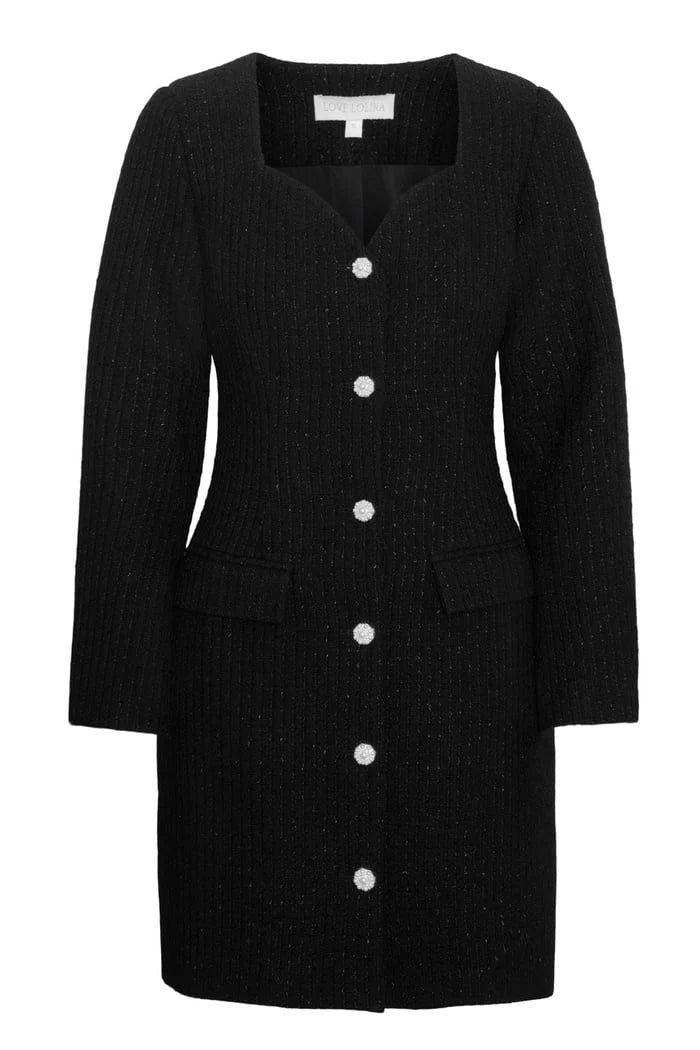 Lilo Mini Dress fra Love Lolina. En tidløs, sort minikjole i teksturert tweed med subtil glittertråd som gir et sofistikert skinn. Kjolen har en feminin hjerteformet utringning, lange ermer og markert midje som fremhever silhuetten. Perlebesatte knapper i front tilfører et luksuriøst preg, mens de dekorative lommene gir balanse mellom klassisk og moderne.
