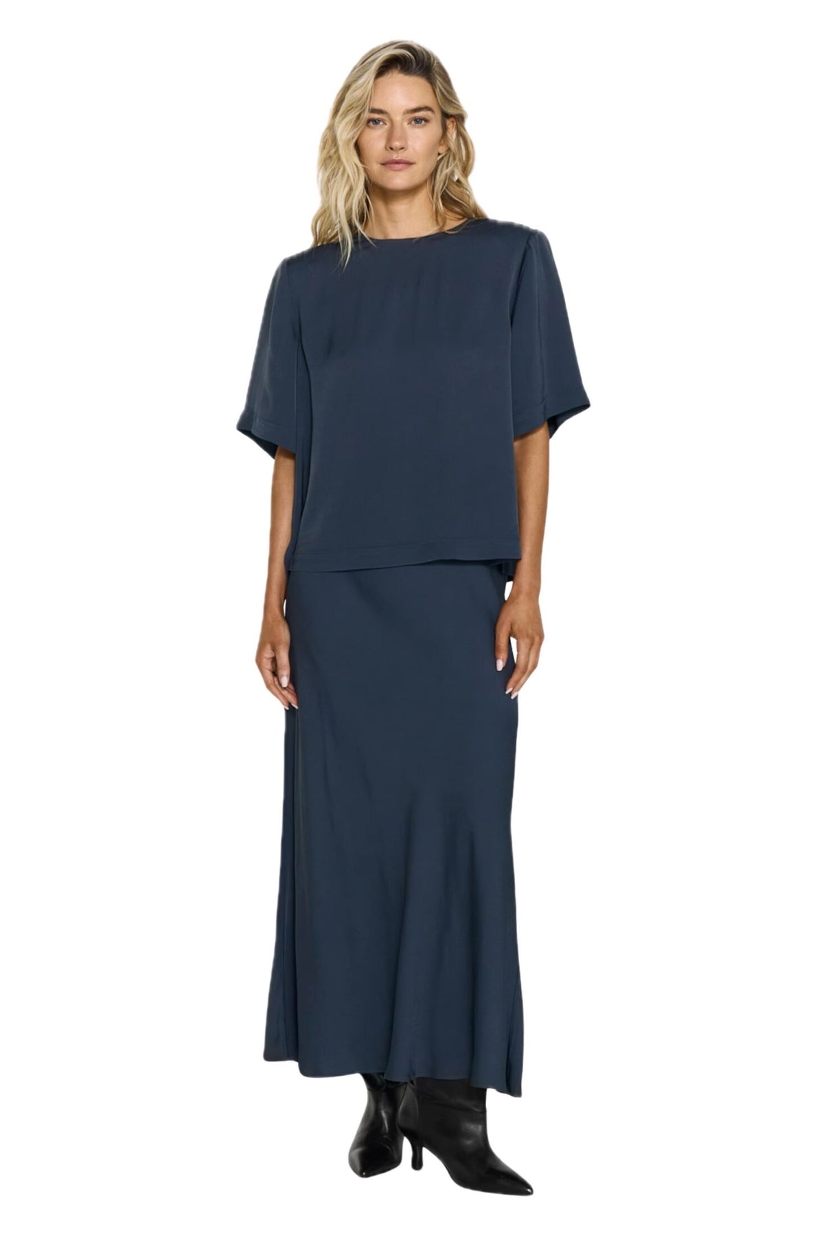 Tyne er et halvlangt skjørt til dame fra Twist & Tango, laget i en skinnende satengkvalitet. Skjørtet har et flatterende skråsnitt og en behagelig, elastisk linning. Perfekt både til hverdags og fest.