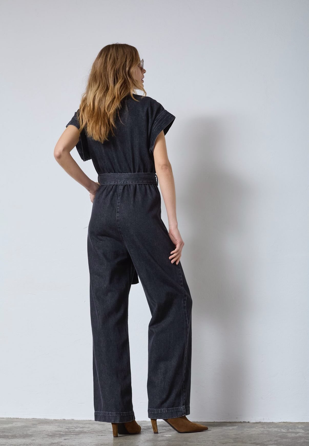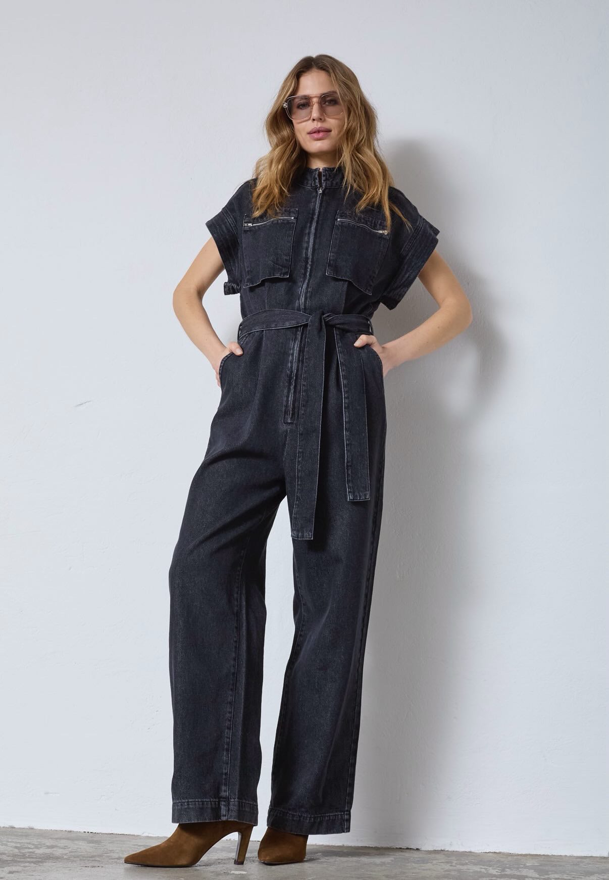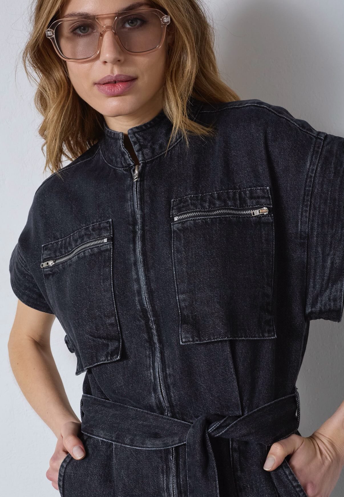 Denne buksedressen kommer i dyp svart farge med frontglidelås, korte ermer og belte i livet for justerbar passform, perfekt for både hverdag og fest.