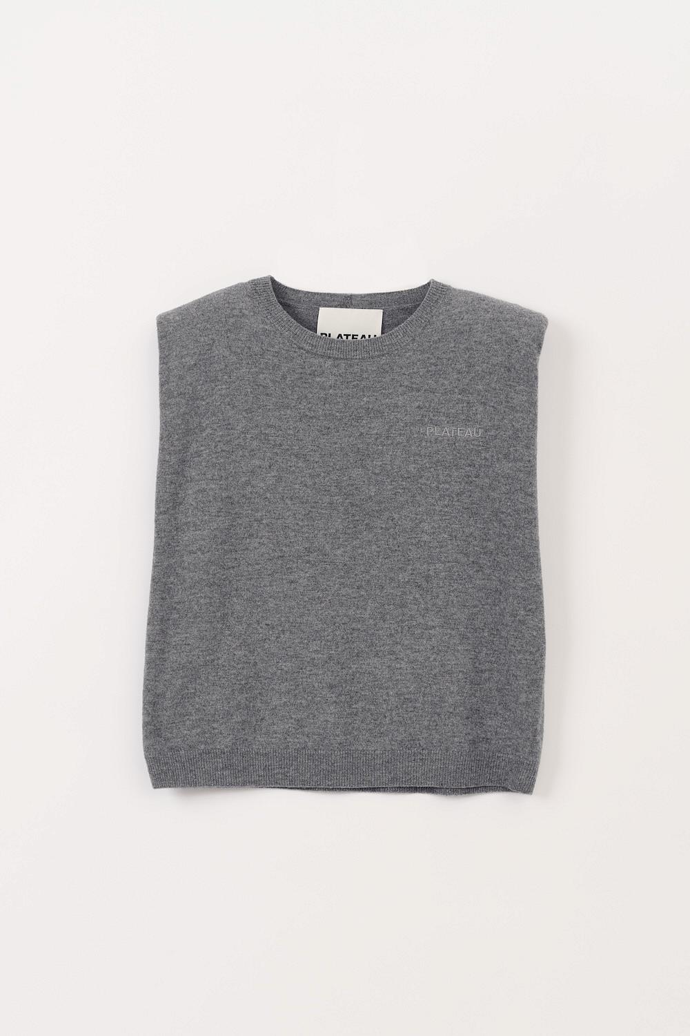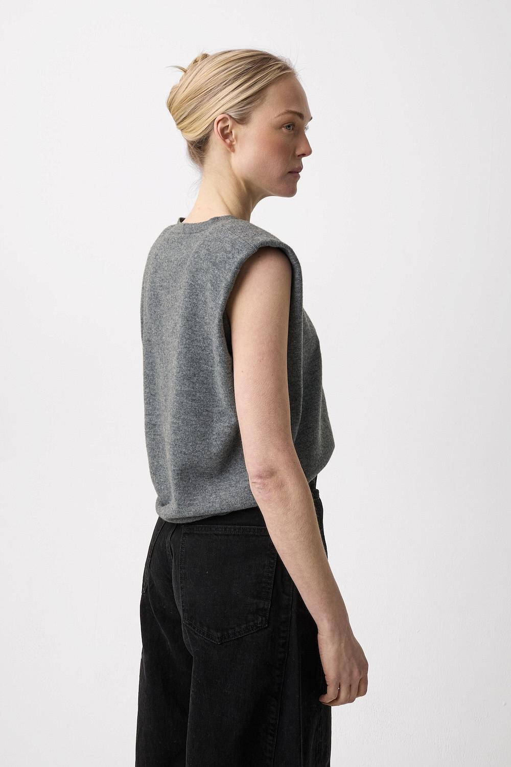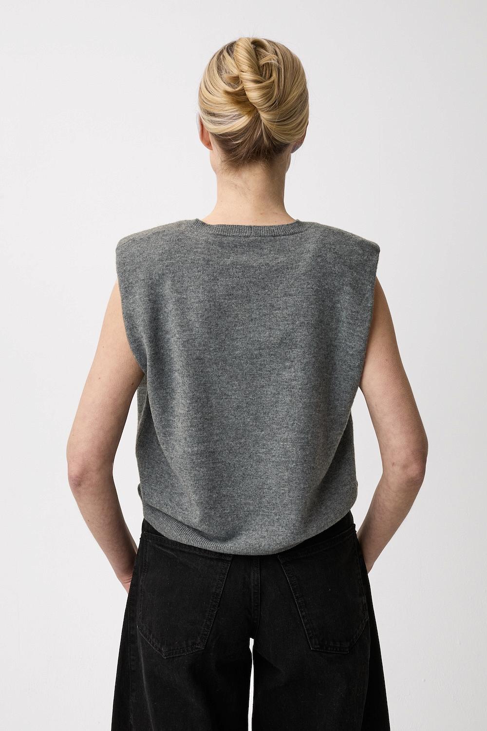 En lys grå strikket vest fra Plateau. Base Top har avtagbare skulderputer og rund hals. Vesten kan styles over en langermet genser, t-skjorte eller skjorte.