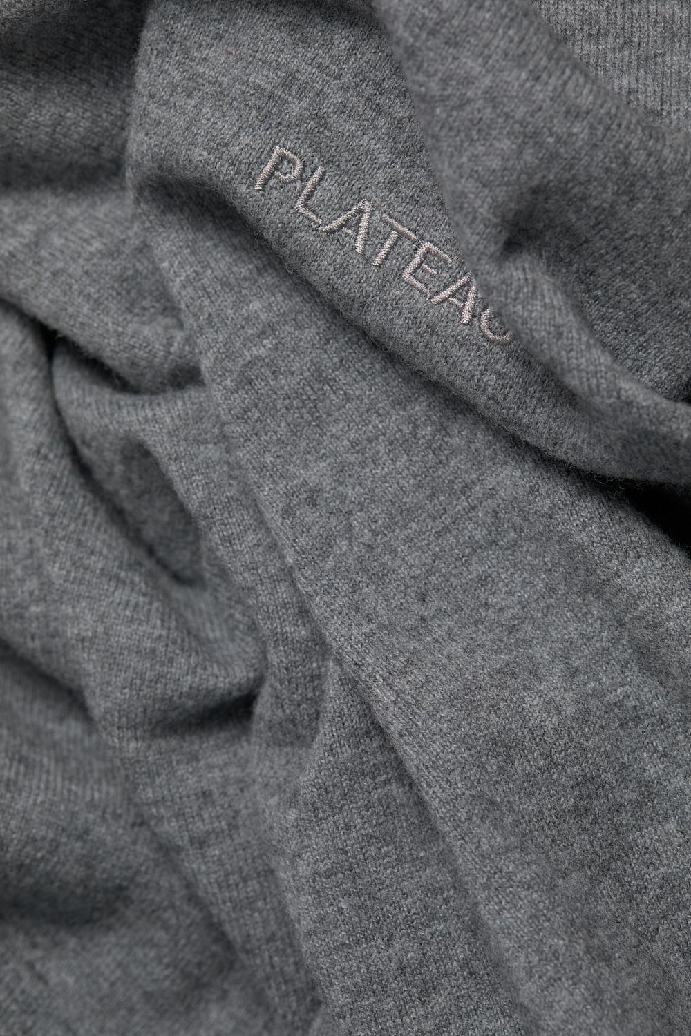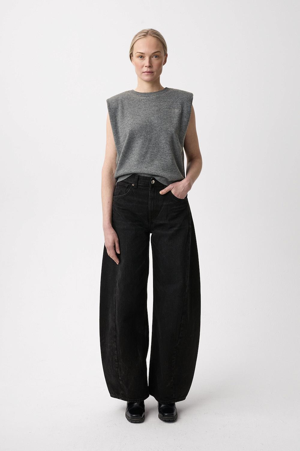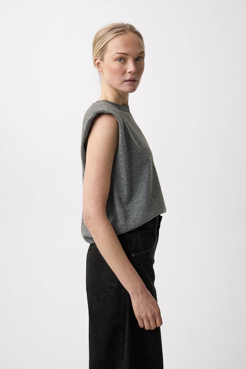 En lys grå strikket vest fra Plateau. Base Top har avtagbare skulderputer og rund hals. Vesten kan styles over en langermet genser, t-skjorte eller skjorte.