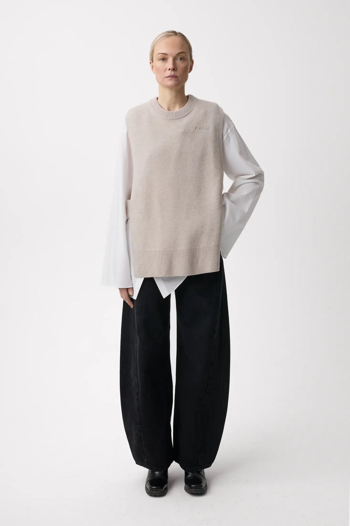 En enkelstrikket vest med avtakbare skulderputer og sølvfargede trykknapper.