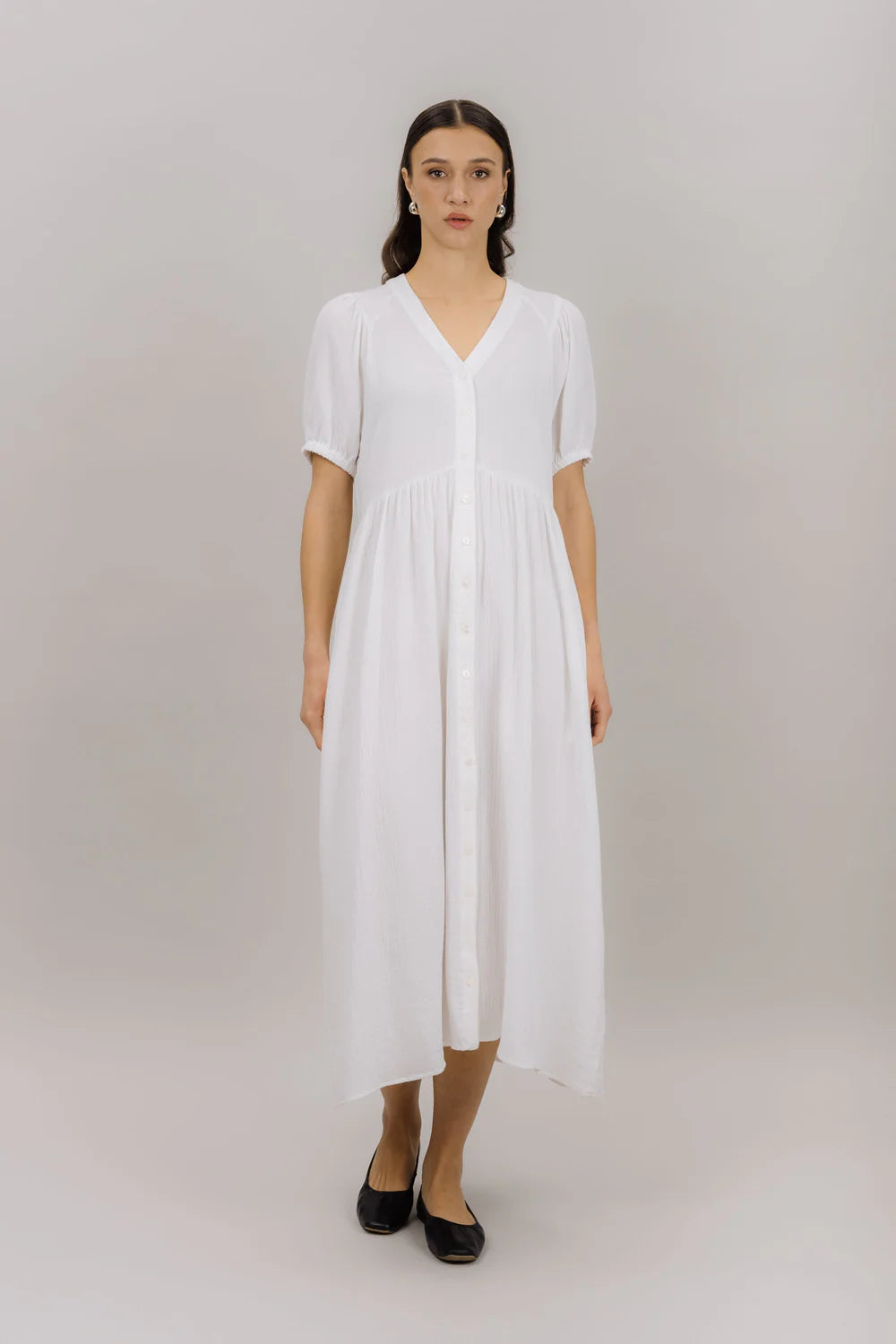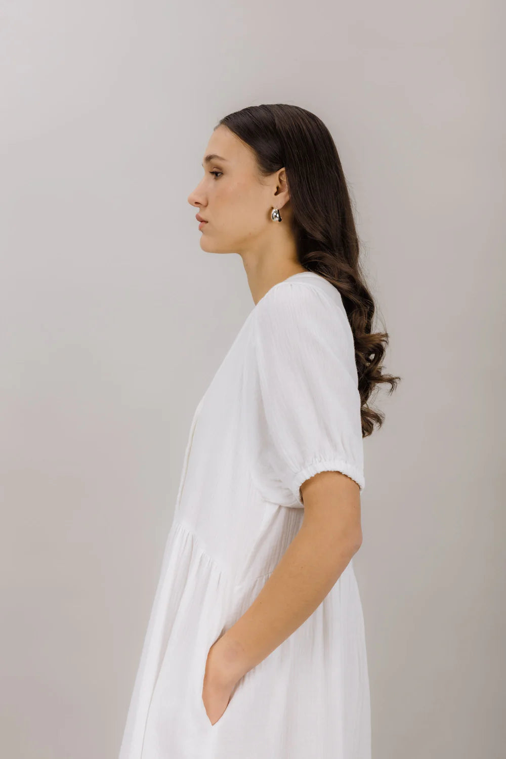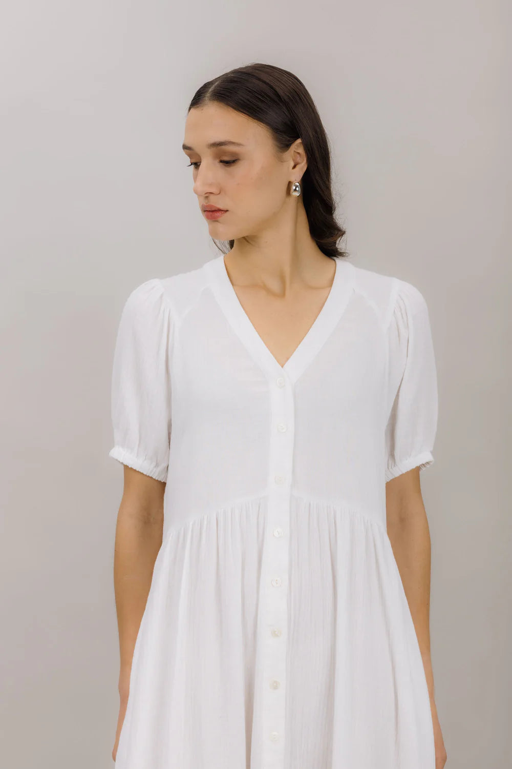 Nissi er en lang kjole designet for enkel femininitet. Laget av myk bomulls, har denne silhuetten en avslappet passform med lett volum og en flatende V-hals. Lett, pustende og ideell for varme dager.