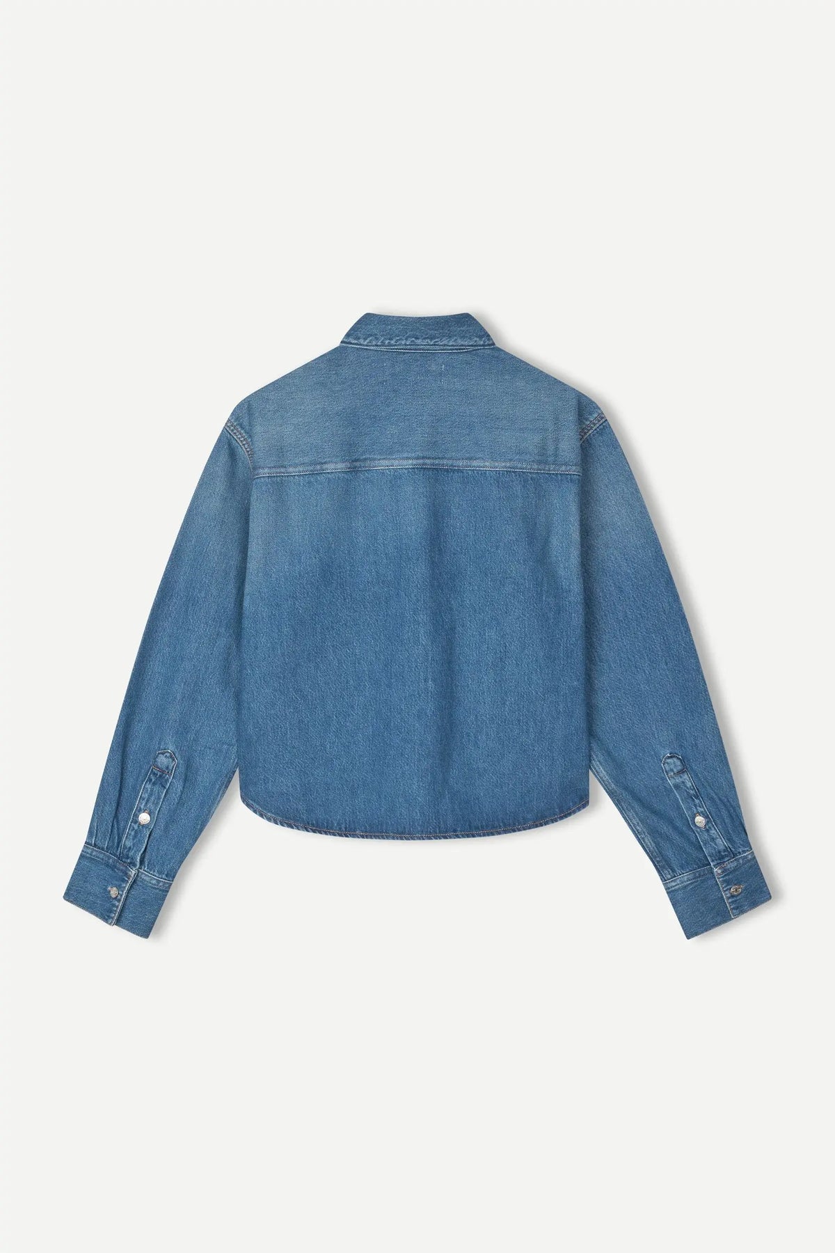 Langermet denimskjorte med løs passform. Knappelukking foran og mansjetter med knapper. Søm i nakken. Hovedmateriale laget av en blanding av økologisk bomull og resirkulert bomull.Modellen er 175 cm høy og har på seg størrelse S.