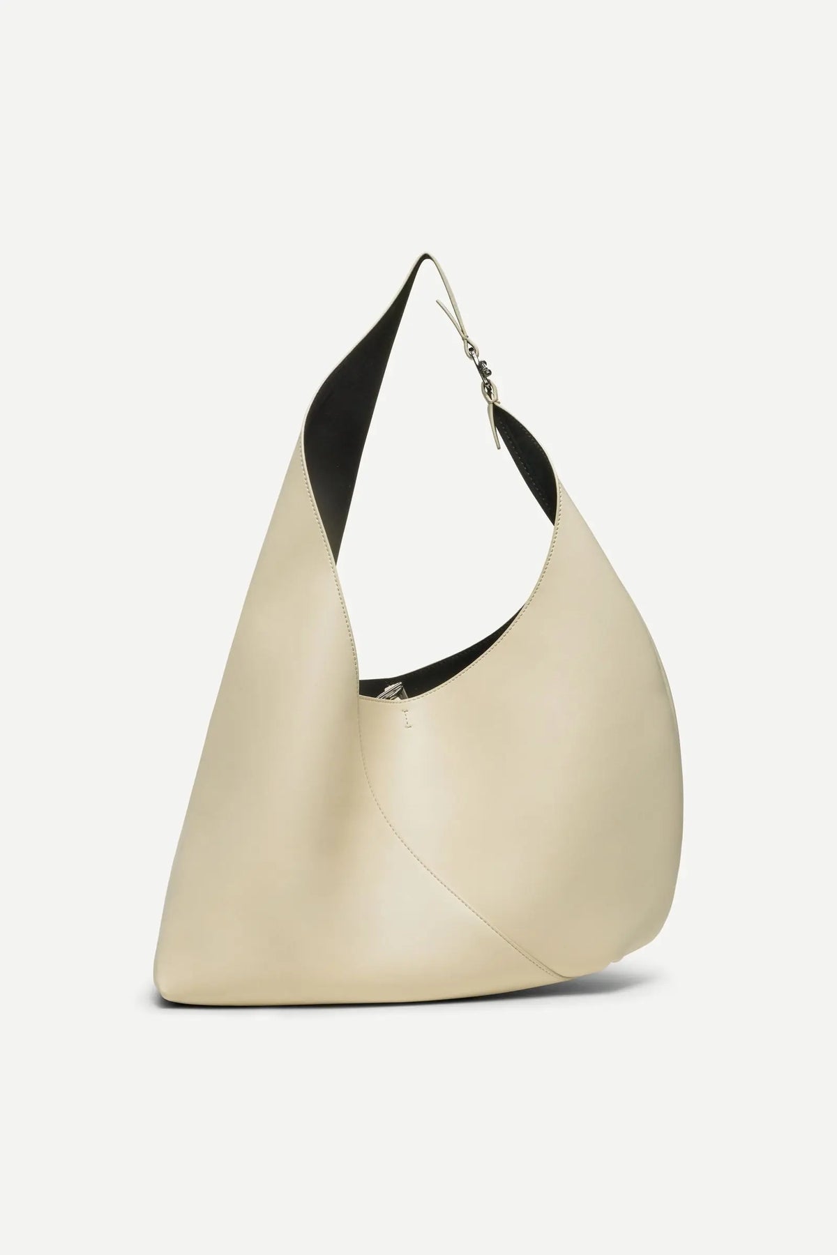 Skulderveske med buet skulderrem. Stanglukking på innsiden. Metalldetaljer formet som det ikoniske ø-et på skulderremmen. Lomme med logo på innsiden. Sølvfarget detaljer.